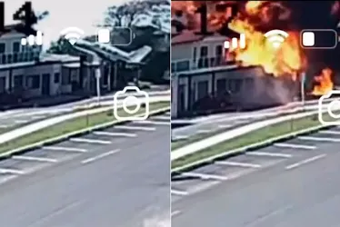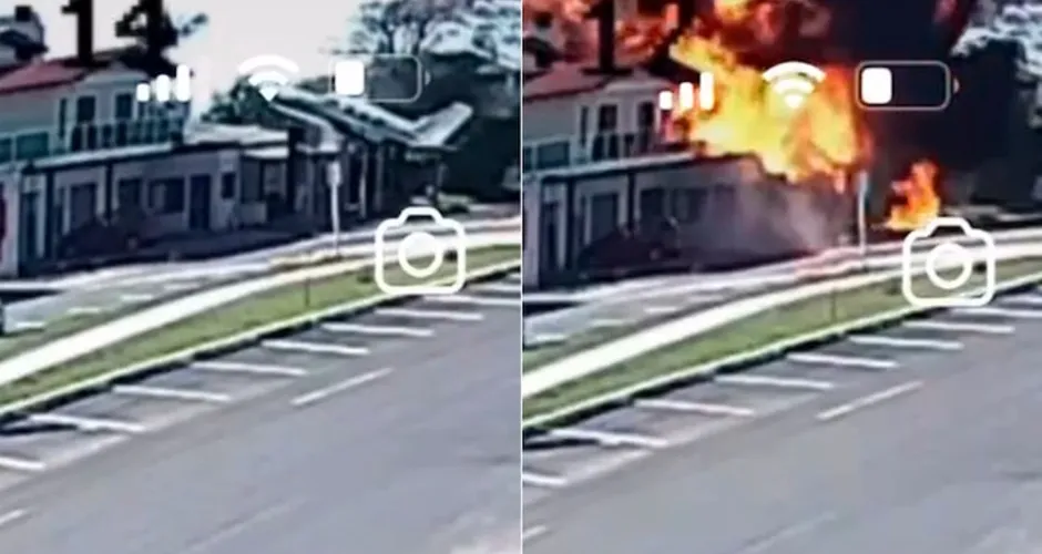 Avião de pequeno porte cai no Litoral Norte do RS; três mortes são confirmadas Aeronave teria colidido em um poste próximo ao fim da pista de decolagem e caiu sobre o restaurante, segundo Corpo de Bombeiros. Não havia clientes no momento. Foto: Reprodução/Câmera de seguran