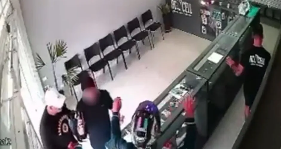 As imagens mostram que havia quatro pessoas no estabelecimento quando o assaltante chegou, usando um boné branco e fazendo menção de estar armado. Ele faz a abordagem no momento em que um homem de capacete saía da loja.