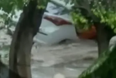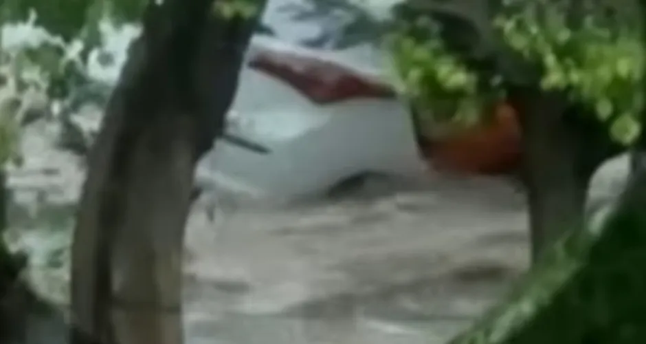 Vídeo gravou o momento em que o carro foi levado pela água. Nas imagens, é possível ver uma mulher e a porta do carro aberta. Algumas pessoas pedem para que ela pule do veículo.