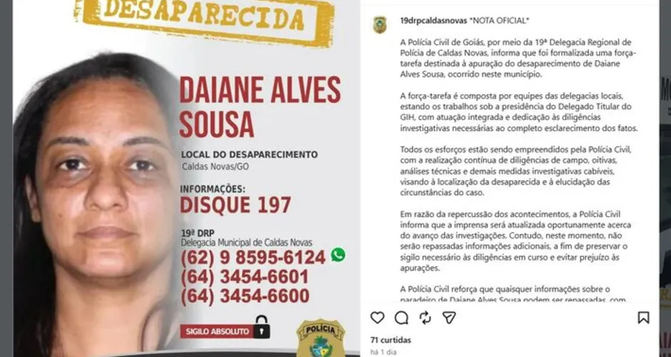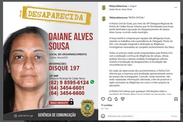 O desaparecimento da corretora de imóveis Daiane Alves Souza completa um mês neste sábado, 17, em Caldas Novas, município turístico do interior de Goiás. Os últimos registros da moradora até o momento seriam do elevador do edifício em que morava.