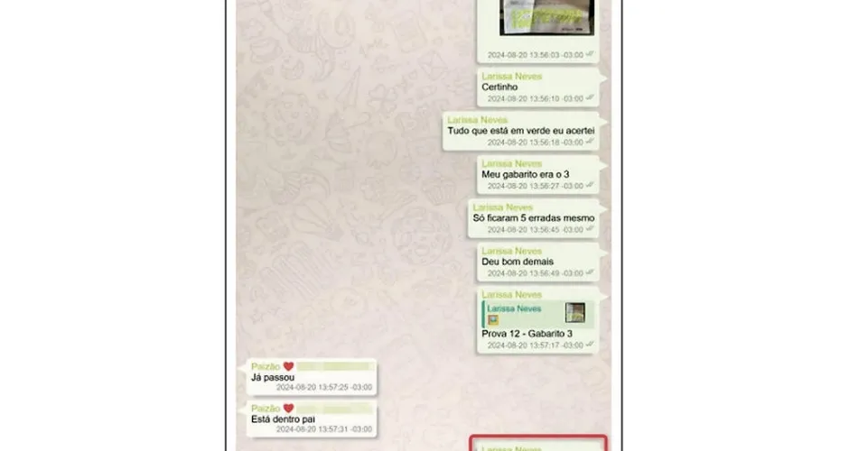 As conversas pelo celular indicam que, antes das 8h do dia 18 de agosto de 2024, quando foram aplicadas as provas, Larissa já tinha acesso a todas as respostas do turno da manhã, que teve início às 9h. Às 11h39 ela recebeu as respostas da prova do turno da tarde, que seriam iniciadas às 14h30.