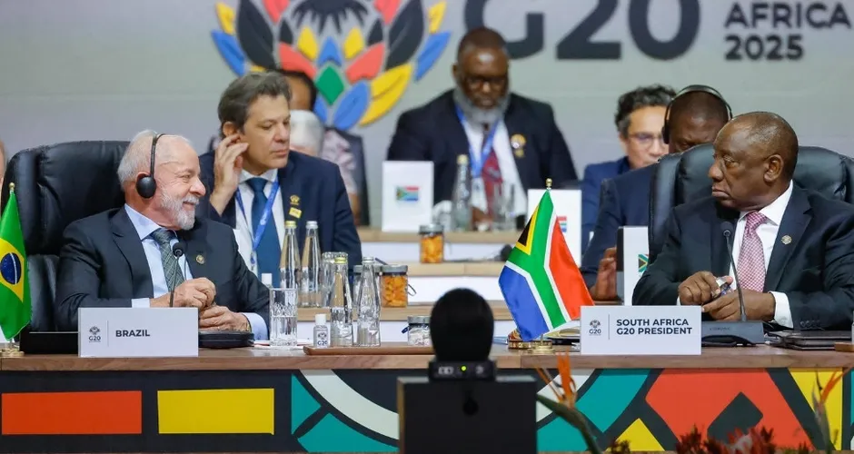 Lula desembarcou em Joanesburgo na sexta-feira (21) e, neste sábado (22), discursou nas duas primeiras sessões temáticas do G20, sobre crescimento econômico sustentável e inclusivo e mudança do clima e redução do risco de desastres.