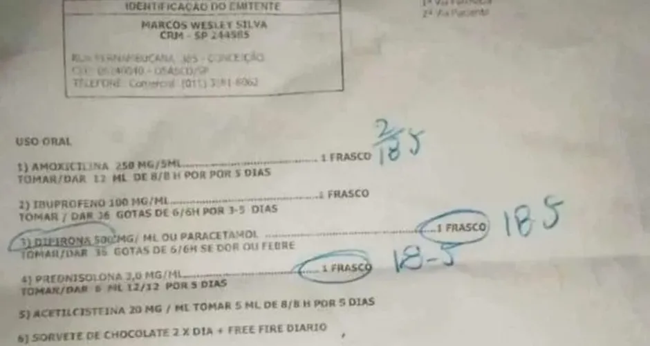 Na receita médica constam cinco indicações de medicamentos: amoxicilina, ibuprofeno, dipirona, prednisolona e acetilcisteína -além de sorvete de chocolate duas vezes por dia, mais Free Fire diário.