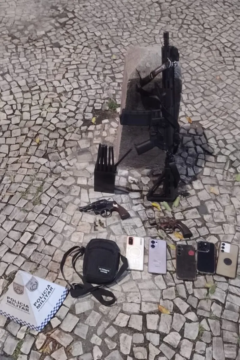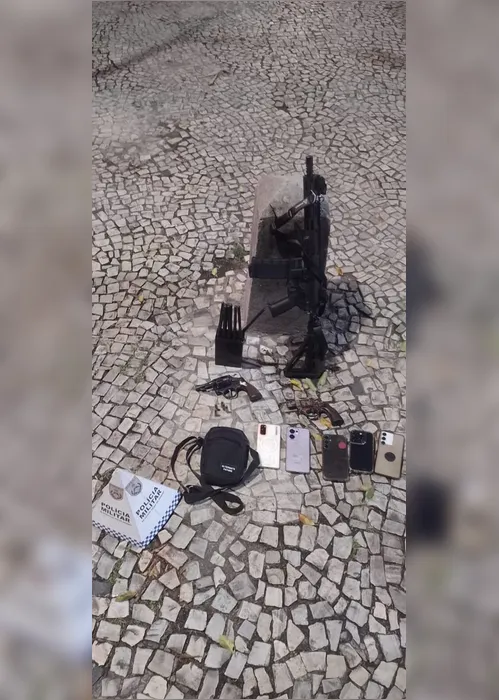 Com eles, foram apreendidos um veículo roubado, um bloqueador de sinal, dois revólveres, uma réplica de fuzil e cinco aparelhos celulares.