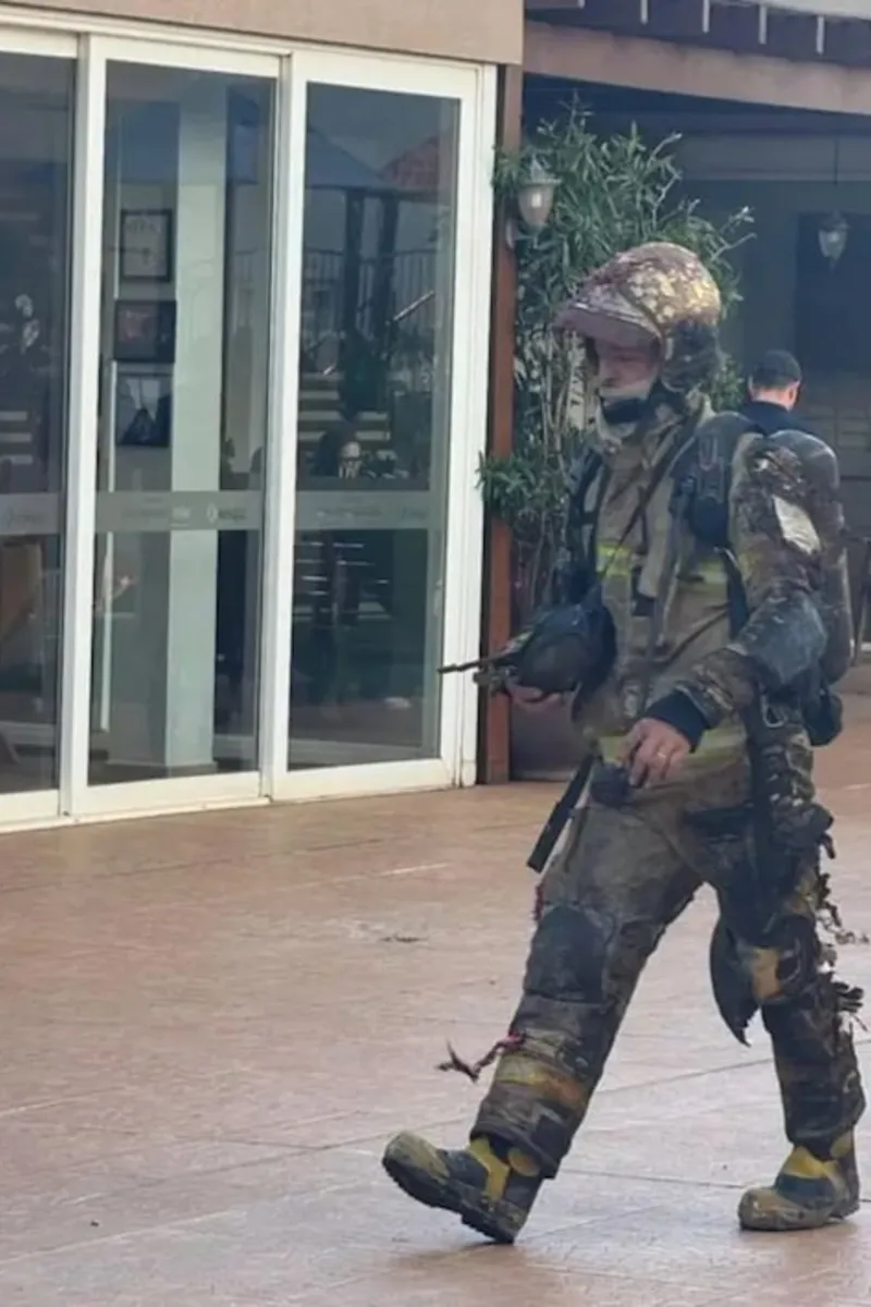 Bombeiro que trabalhou no combate ao incêndio no apartamento com parte da roupa derretida pelo fogo Foto: Bombeiros/Divulgação