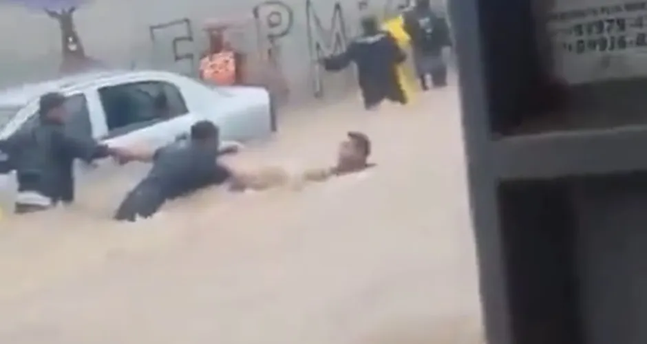 Para resgatar a vítima, três homens fizeram uma espécie de cordão humano. O da ponta aparentemente se segura em um carro, e o da outra ponta se estica para salvar o rapaz que estava sendo levado pela água.