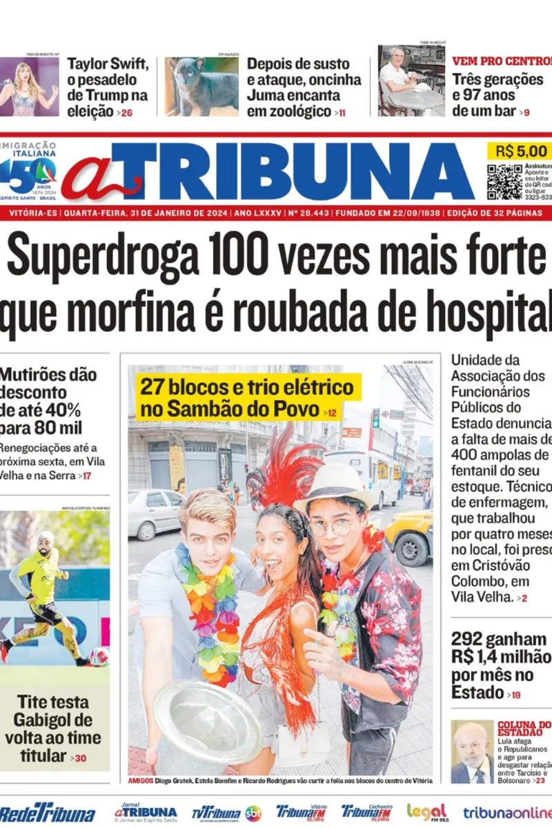 A edição do jornal A Tribuna desta quarta-feira, dia 31 de janeiro, traz em destaque que superdroga 100 vezes mais forte que morfina é roubada de hospital.