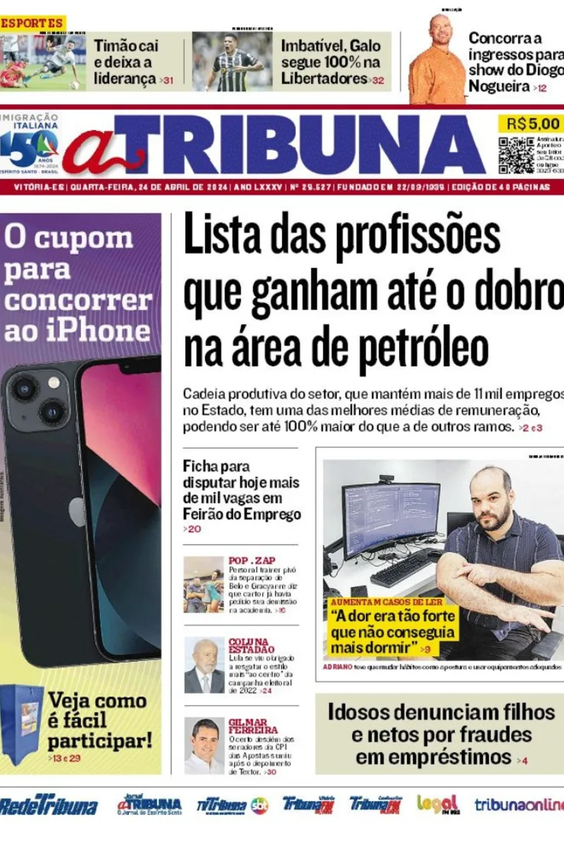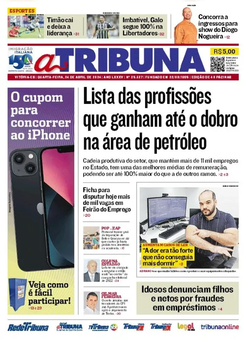 A edição do jornal A Tribuna desta quarta-feira, dia 24 de abril, traz em destaque lista das profissões que ganham até o dobro na área de petróleo.