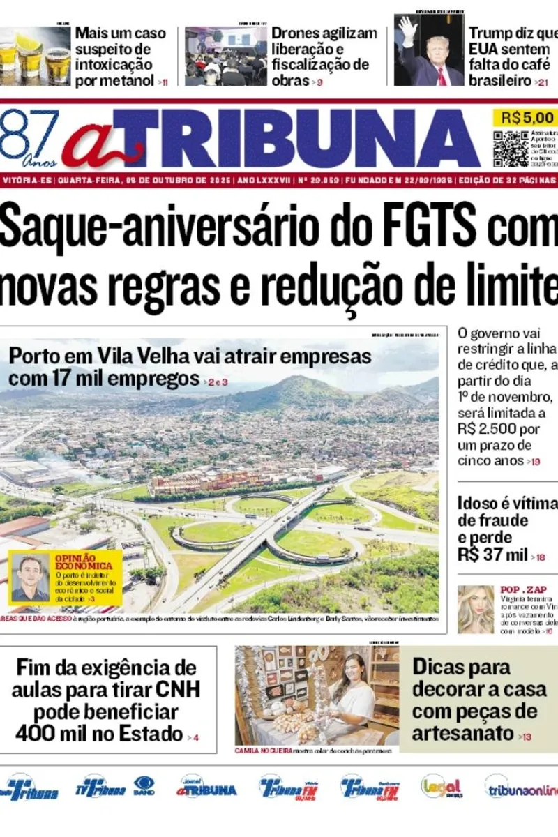 A edição do jornal A Tribuna desta quarta-feira, 08 de outubro, traz em destaque asnovas regras e redução de limite do saque-aniversário do FGTS.