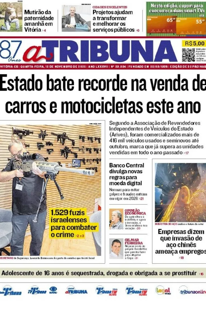 A edição do jornal A Tribuna desta quarta-feira, 12 de novembro, traz em destaque que o Espírito Santo bateu recorde na venda de carros e motocicletas este ano.