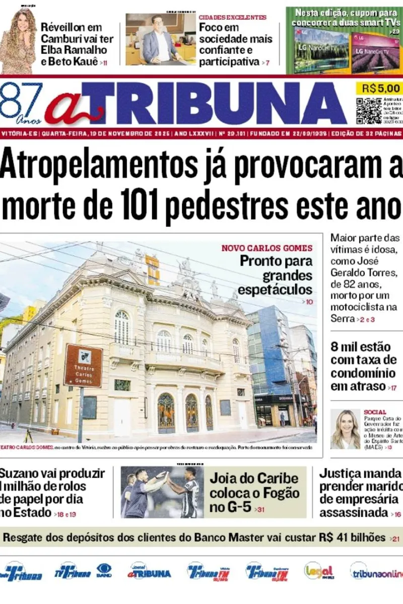 A edição do jornal A Tribuna desta quarta-feira, 19 de novembro, traz em destaque que atropelamentos já causaram a morte de 101 pedestres este ano.