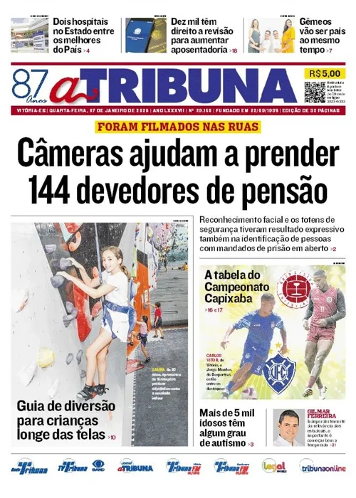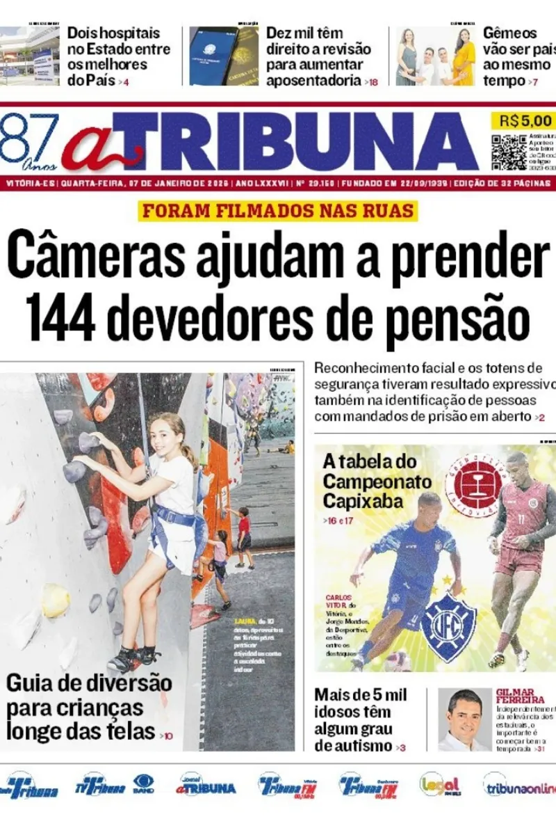A edição do jornal A Tribuna desta quarta-feira, 07 de janeiro, traz em destaque que câmeras ajudam a prender 144 devedores de pensão.