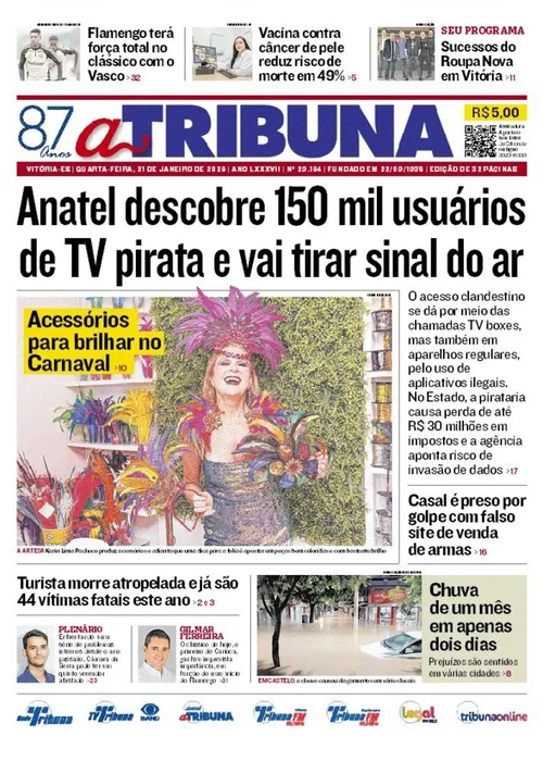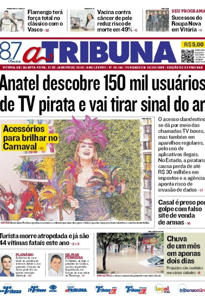 A edição do jornal A Tribuna desta quarta-feira, 21 de janeiro, traz em destaque que Anatel descobre 150 mil usuários de TV pirata e vai tirar sinal do ar.