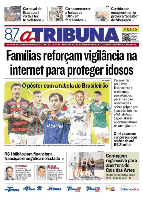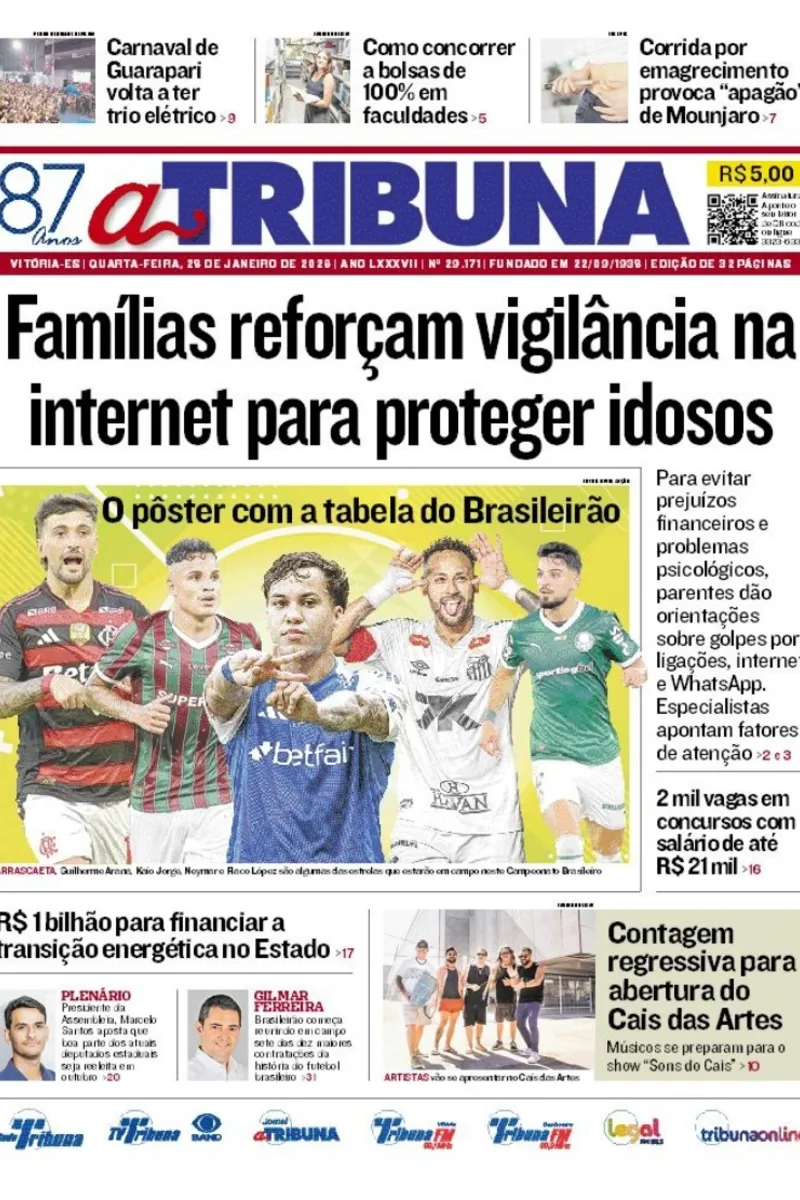 A edição do jornal A Tribuna desta quarta-feira, 28 de janeiro, traz em destaque que famílias reforçam vigilância na internet para proteger idosos.