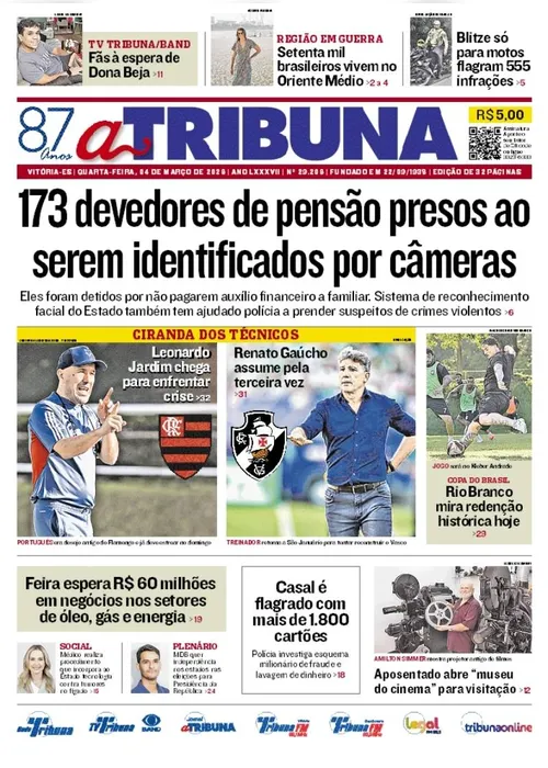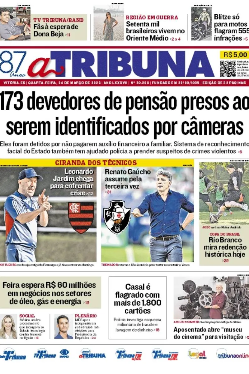 A edição do jornal A Tribuna desta quarta-feira, 4 de março, traz em destaque 173 devedores de pensão presos ao serem identificados por câmeras.