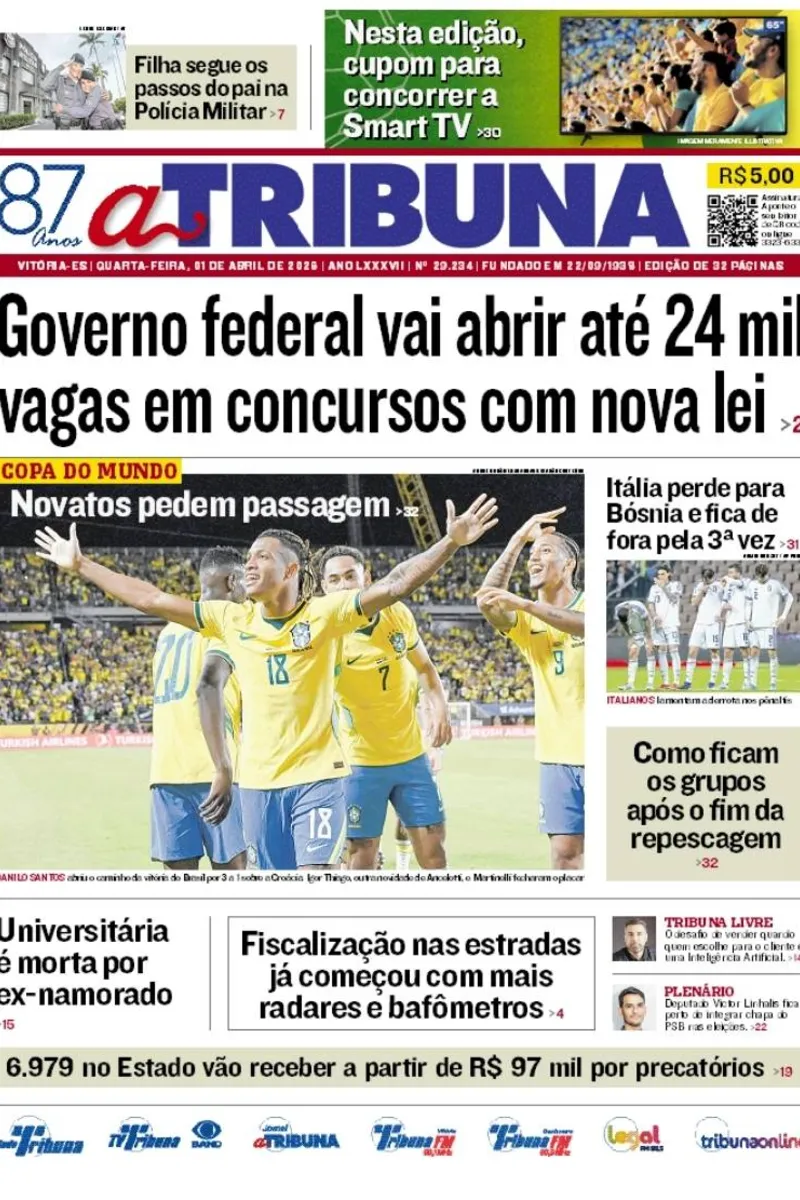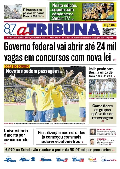 A edição do jornal A Tribuna desta quarta-feira, 1º de abril, traz em destaque que governo federal vai abrir até 24 mil vagas em concursos com nova lei.