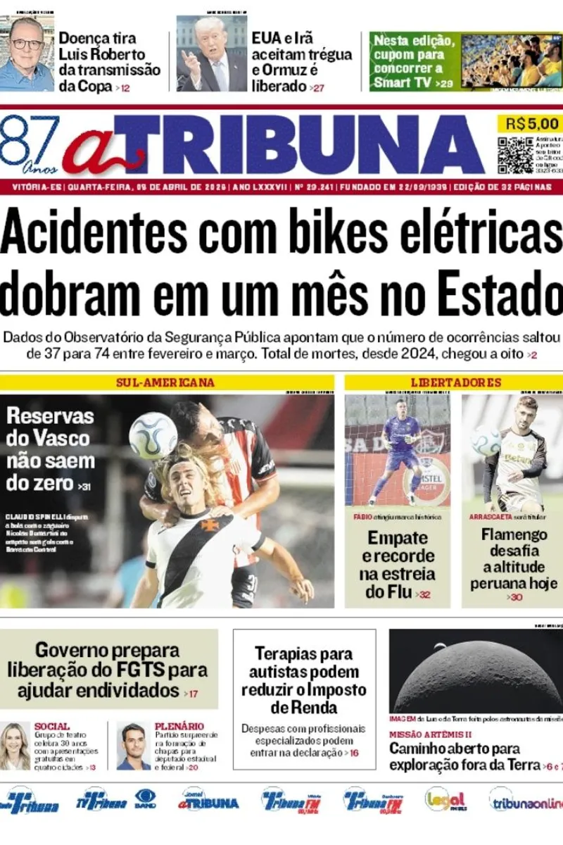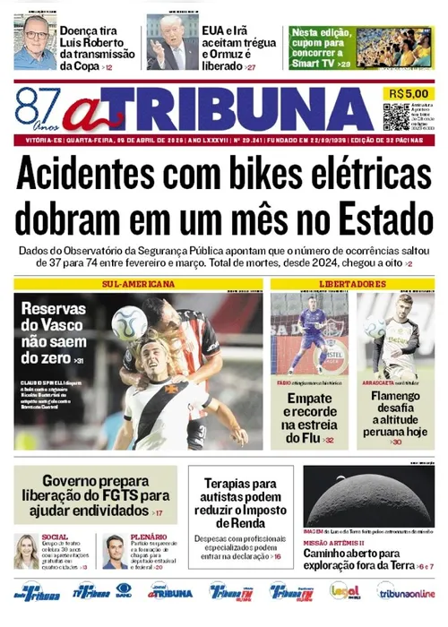 A edição do jornal A Tribuna desta quarta-feira, 8 de abril, traz em destaque que acidentes com bikes elétricas dobram em um mês no Estado.