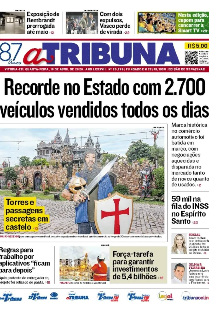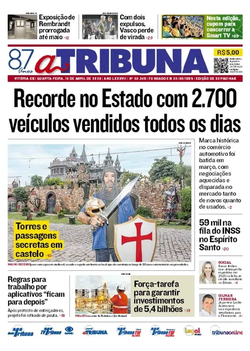 A edição do jornal A Tribuna desta quarta-feira, 14 de abril, traz em destaque recorde no Estado com 2.700 veículos vendidos todos os dias.