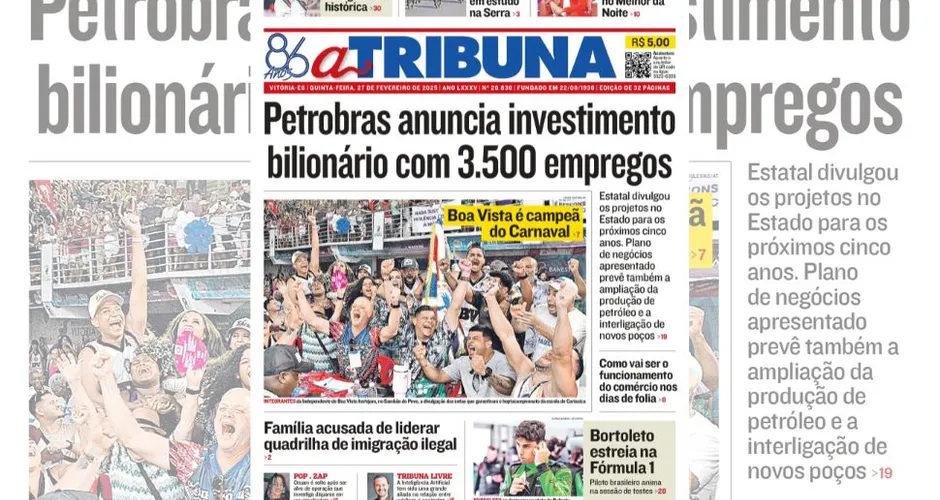 A edição do jornal A Tribuna desta quinta-feira, dia 27 de fevereiro, traz em destaque que a Petrobras anuncia investimento bilionário com 3.500 empregos.