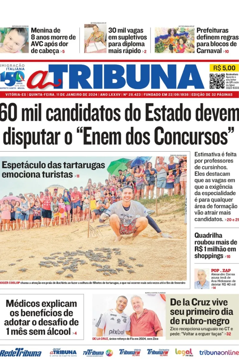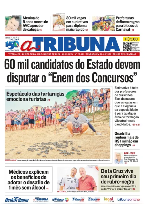 A edição do jornal A Tribuna desta quinta-feira, dia 11 de janeiro, traz em destaque que 60 mil candidatos do Estado devem disputar o “Enem dos Concursos”.