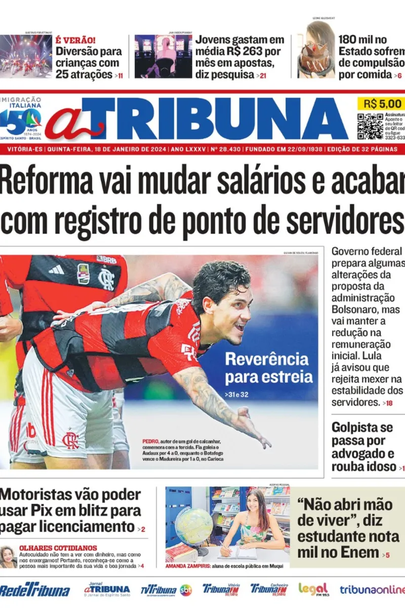 A edição do jornal A Tribuna desta quinta-feira, dia 18 de janeiro, destaca que reforma vai mudar salários e acabar com registro de ponto de servidores.