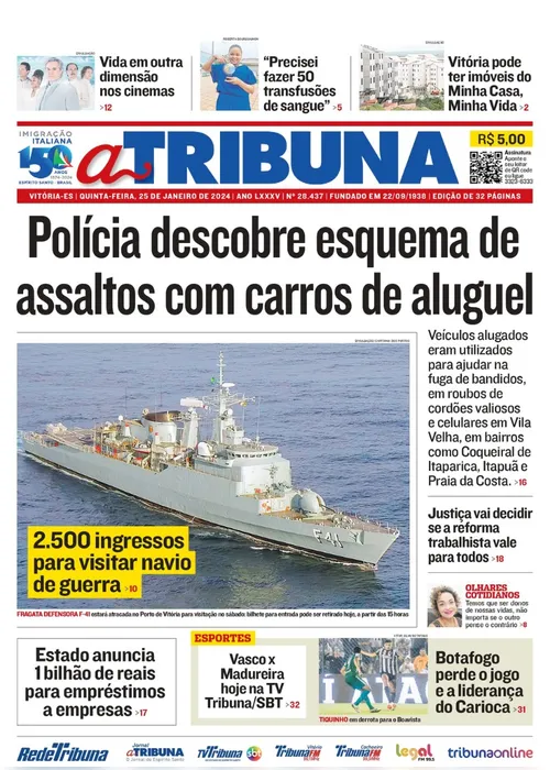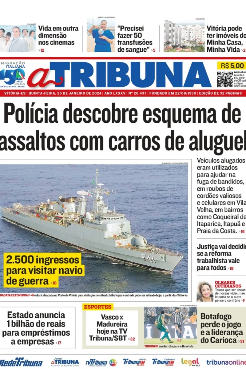A edição do jornal A Tribuna desta quinta-feira, dia 25 de janeiro, destaca que polícia descobre esquema de assaltos com carros de aluguel.