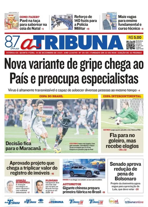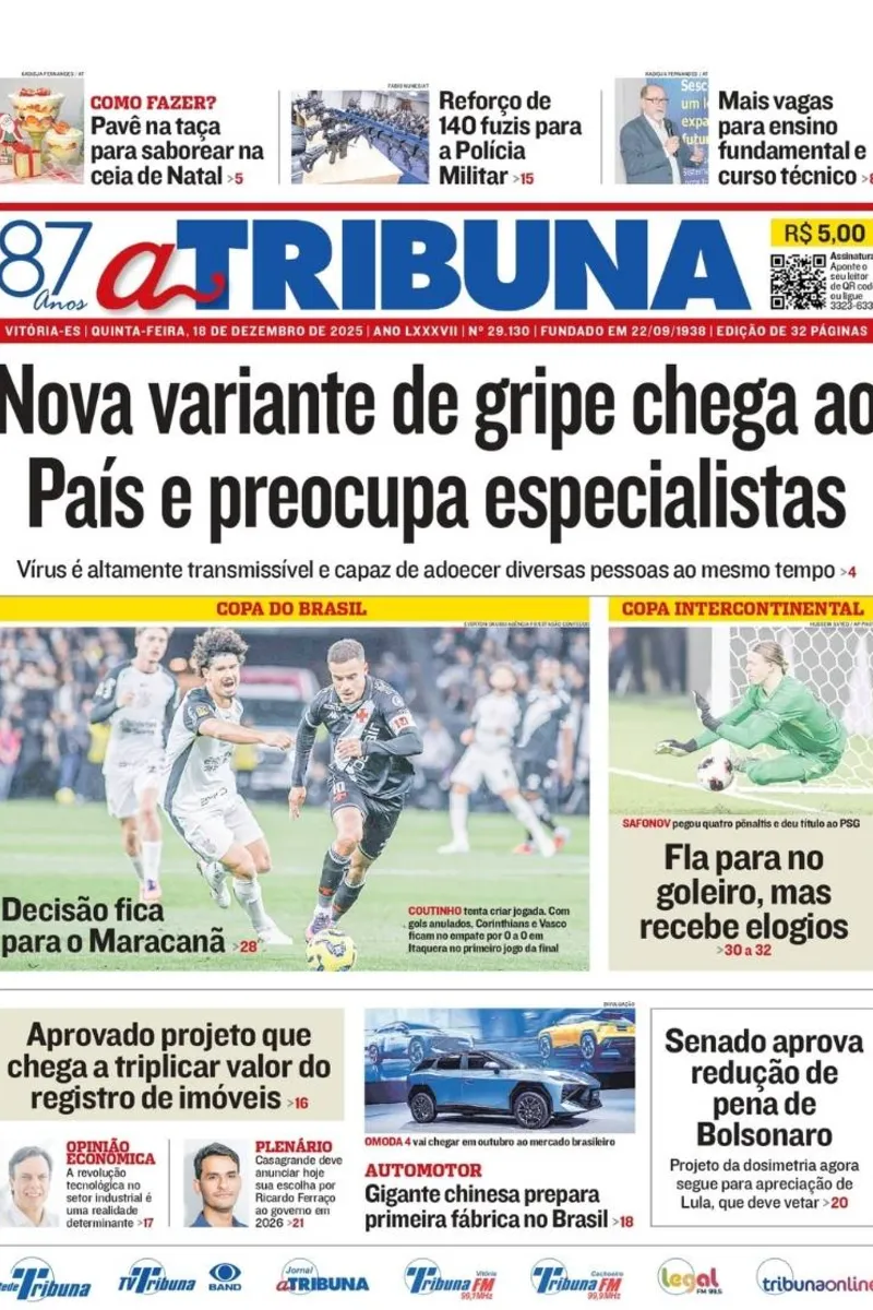 A edição do jornal A Tribuna desta quinta-feira, 18 de dezembro traz em destaque que uma nova variante de gripe chega ao País e preocupa especialistas.