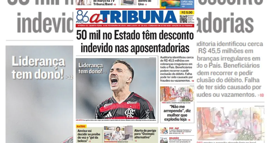 A edição do jornal A Tribuna desta quinta-feira, dia 13 de fevereiro, traz em destaque um problema de segurança social: 50 mil no Estado têm desconto indevido nas aposentadorias.