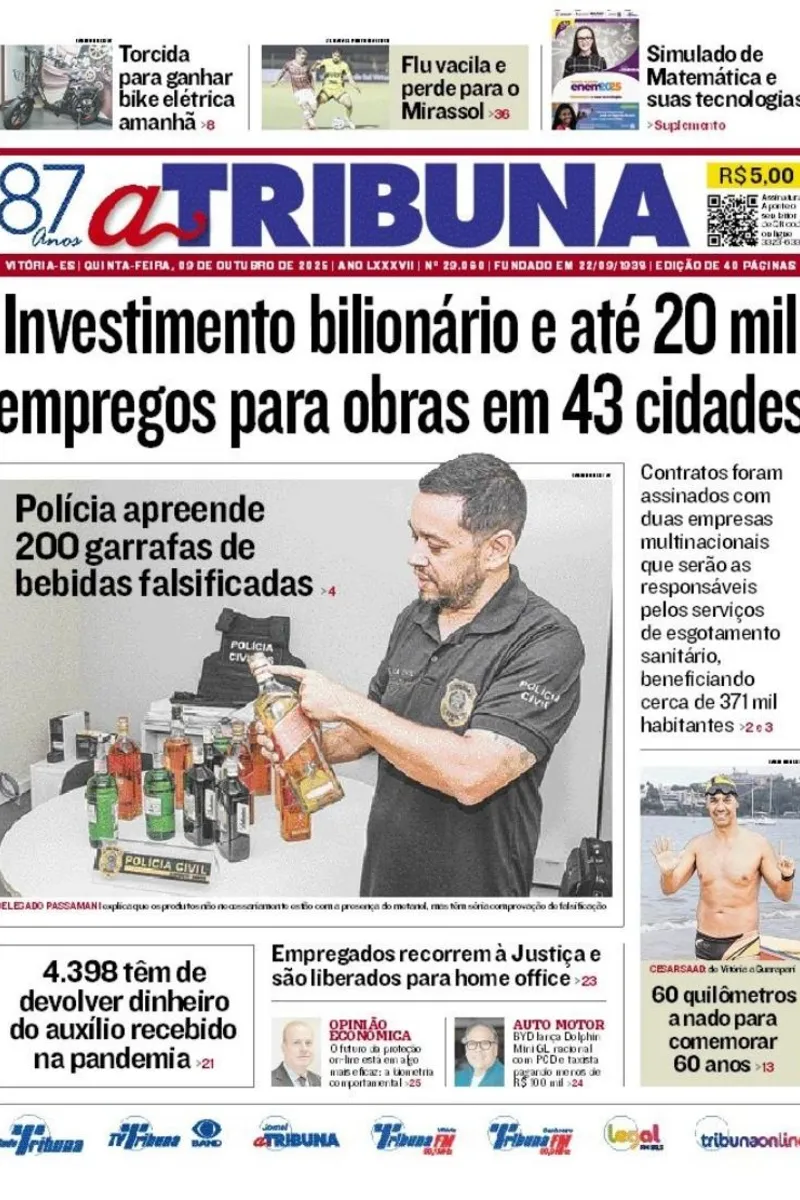 A edição do jornal A Tribuna desta quinta-feira, 09 de outubro, traz em destaque o investimento bilionário e até 20 mil empregos para obras em 43 cidades.