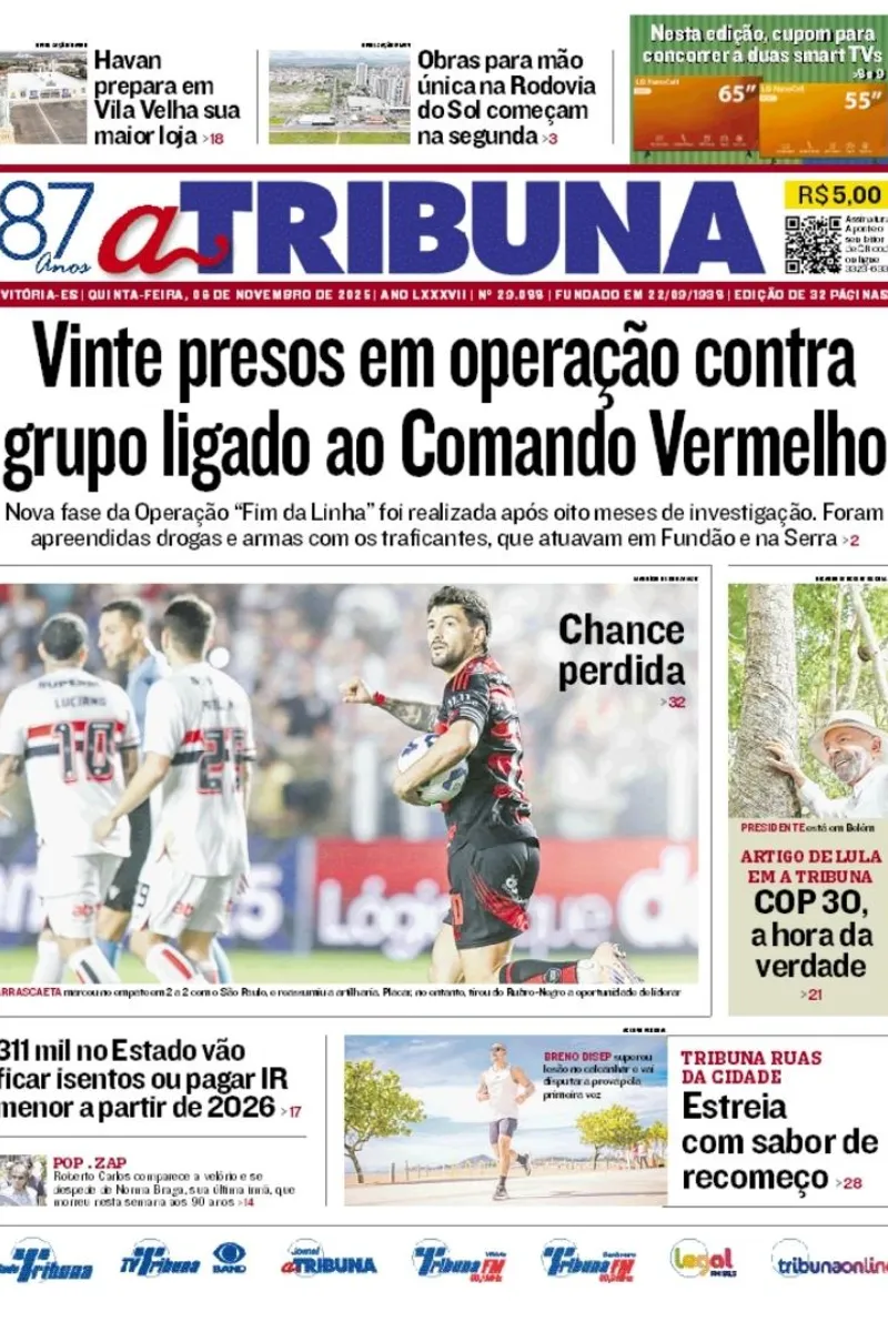 A edição do jornal A Tribuna desta quinta-feira, 06 de novembro, traz em destaque que vinte foram presos em operação contra grupo ligado ao Comando Vermelho.