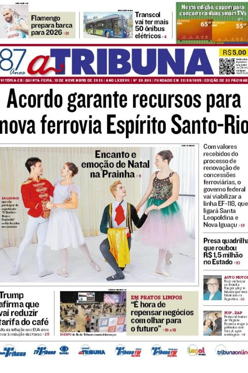 A edição do jornal A Tribuna desta quarta-feira, 13 de novembro, traz em destaque que Acordo garante recursos para nova ferrovia Espírito Santo-Rio.