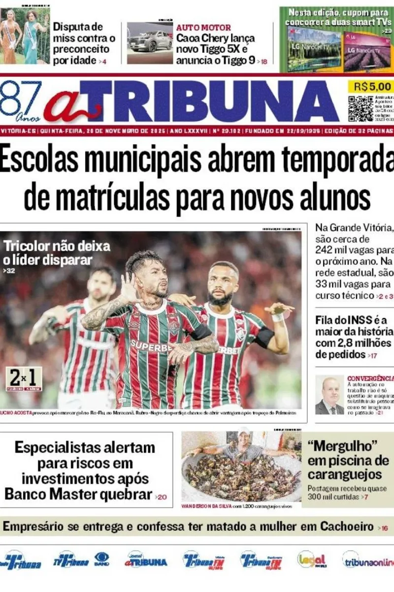 A edição do jornal A Tribuna desta quinta-feira, 20 de novembro, traz em destaque que escolas municipais abrem temporada de matrículas para novos alunos.