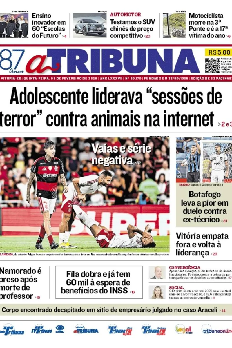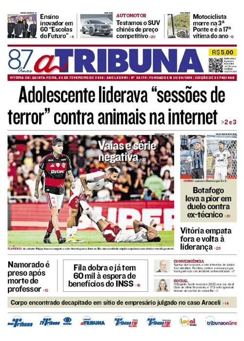 A edição do jornal A Tribuna desta quinta-feira, 05 de fevereiro, traz em destaque que adolescente apreendido no Espírito Santo liderava “sessões de terror” contra animais na internet.
