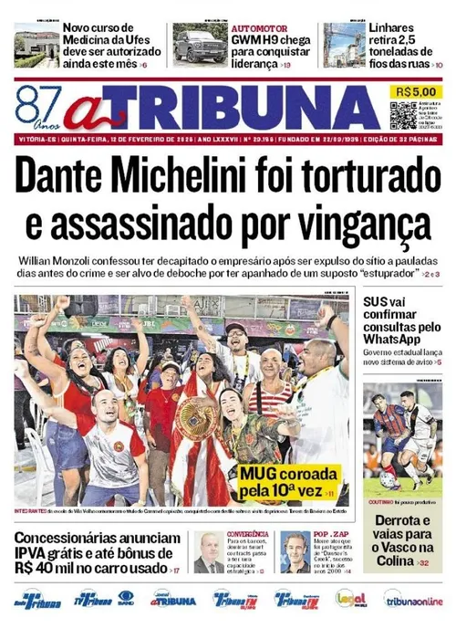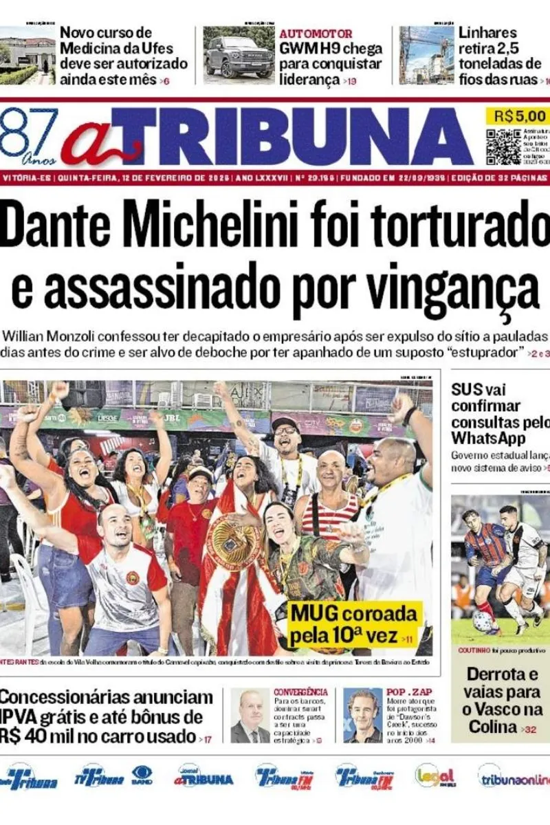 A edição do jornal A Tribuna desta quinta-feira, 12 de fevereiro, traz em destaque que Dante Michelini foi torturado e assassinado por vingança.