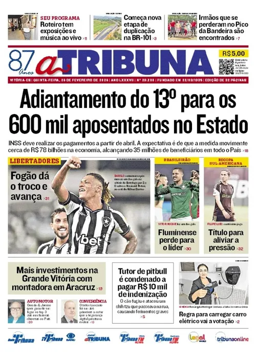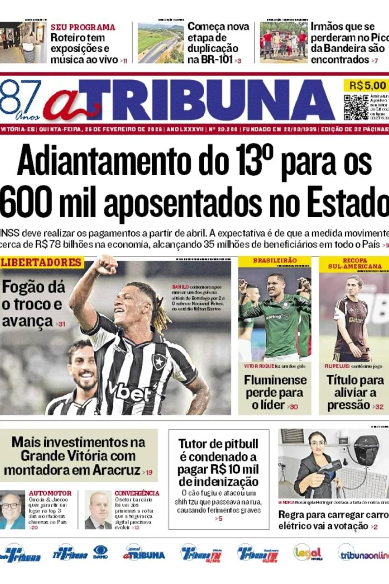 A edição do jornal A Tribuna desta quinta-feira, 26 de fevereiro, traz em destaque o adiantamento do 13º para os 600 mil aposentados no Estado.