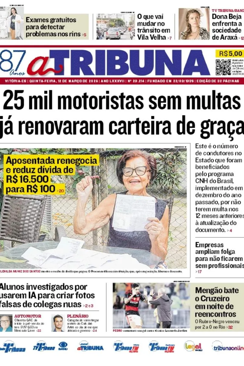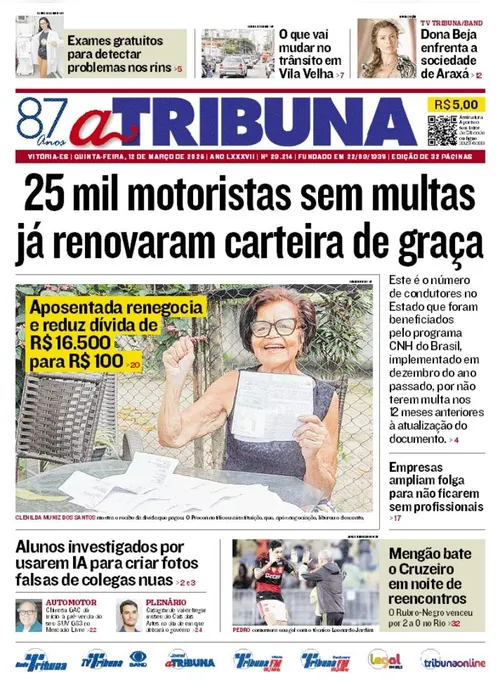 A edição do jornal A Tribuna desta quinta-feira, 12 de março, traz em destaque que 25 mil motoristas sem multas já renovaram carteira de graça.