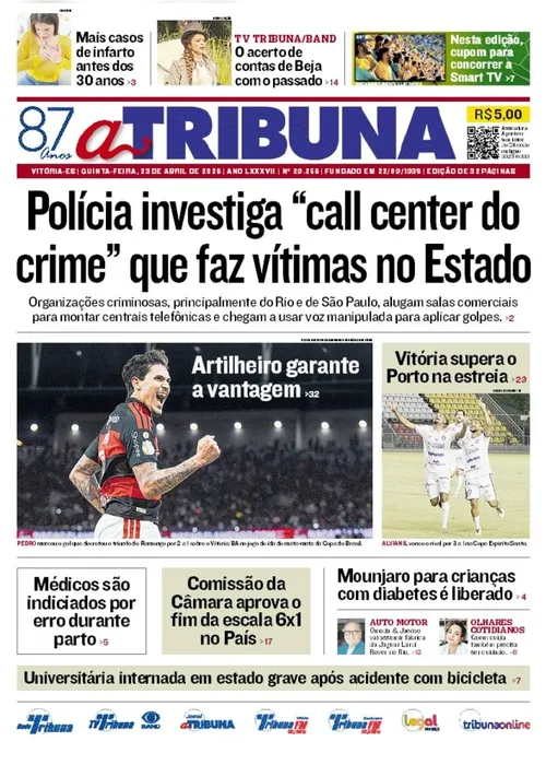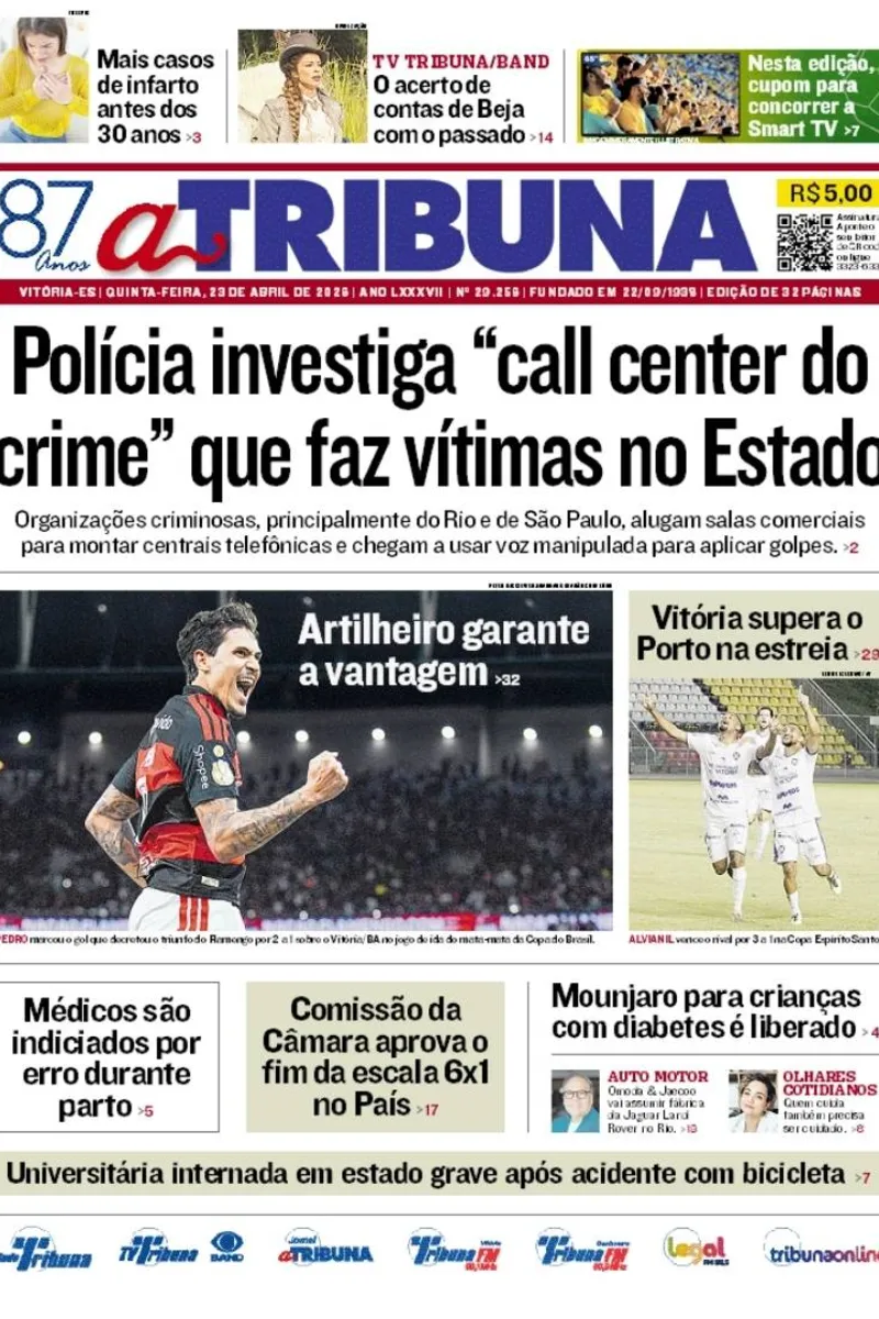 A edição do jornal A Tribuna desta quinta-feira, 23 de abril, traz em destaque que polícia investiga “call center do crime” que faz vítimas no Estado.