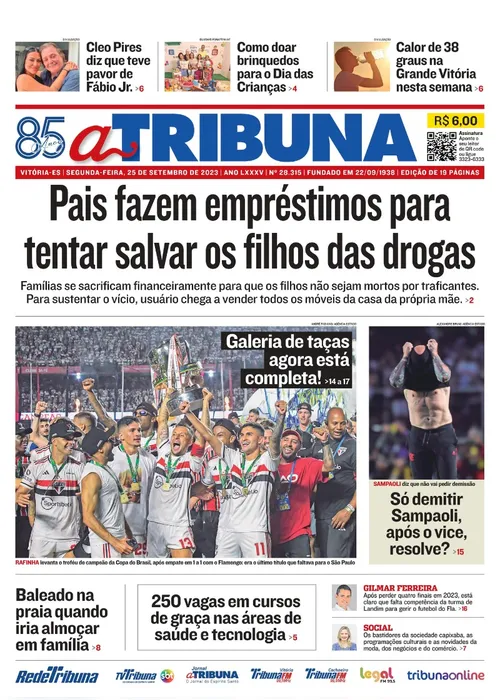 A edição do jornal A Tribuna desta segunda-feira, dia 25 de setembro, traz em destaque que pais fazem empréstimos para tentar salvar os filhos das drogas.
