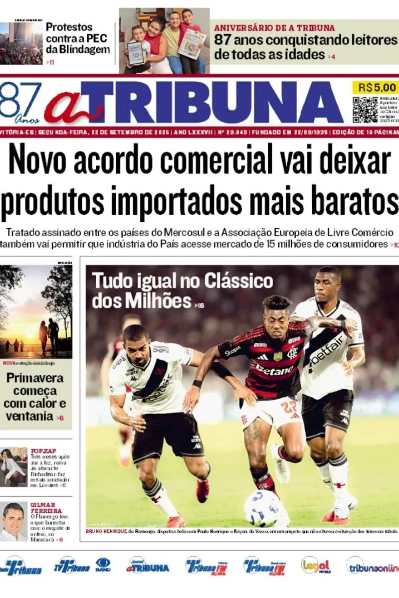 A edição do jornal A Tribuna desta segunda-feira, 22 de setembro, traz em destaque que novo acordo comercial vai deixar produtos importados mais baratos.