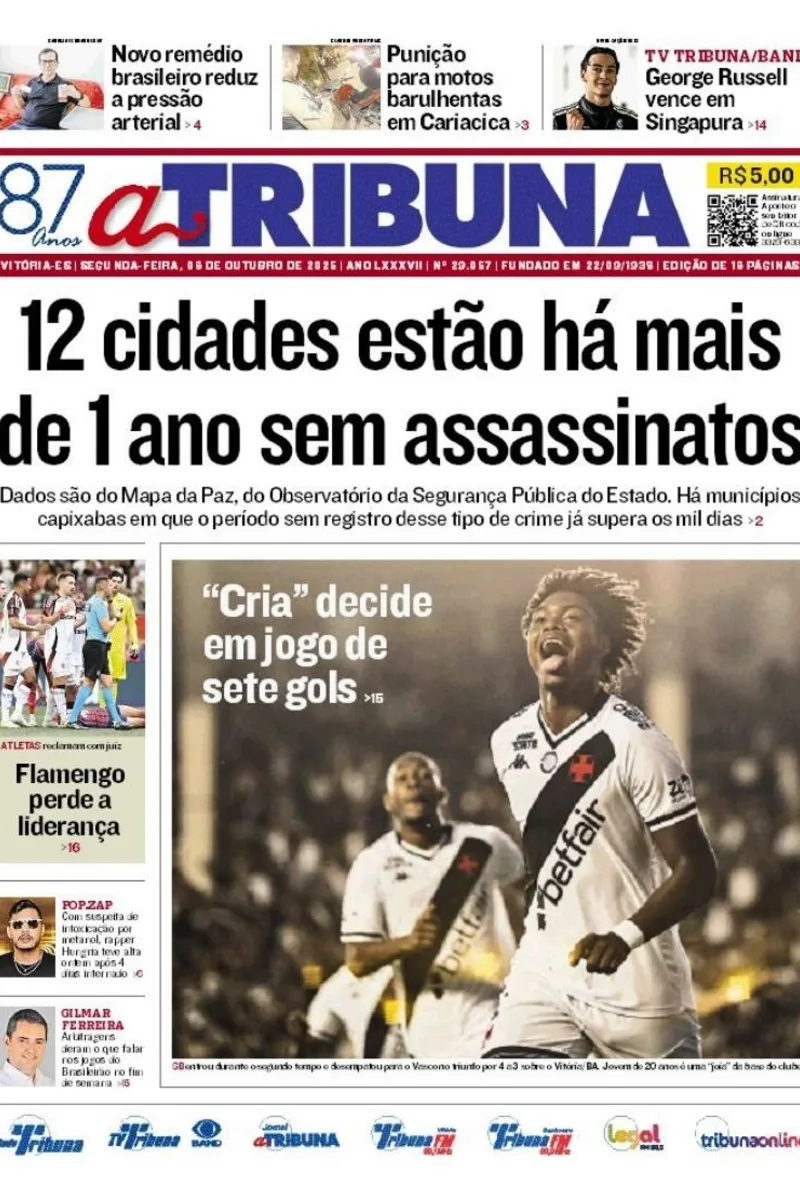 A edição do jornal A Tribuna desta segunda-feira, 06 de outubro, traz em destaque as 12 cidades do ES que estão há mais de 1 ano sem assassinatos.