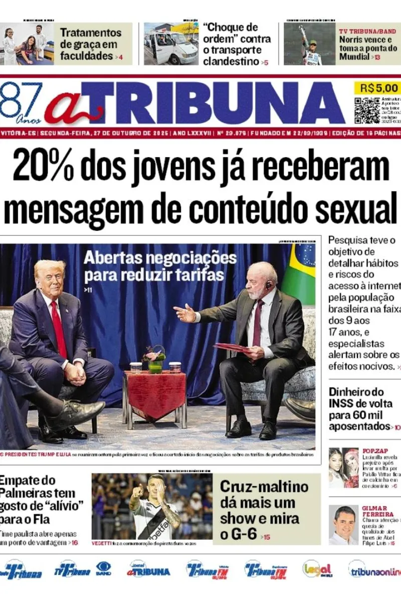 A edição do jornal A Tribuna desta segunda-feira, 27 de outubro, traz em destaque que  20% dos jovens já receberam mensagem de conteúdo sexual.