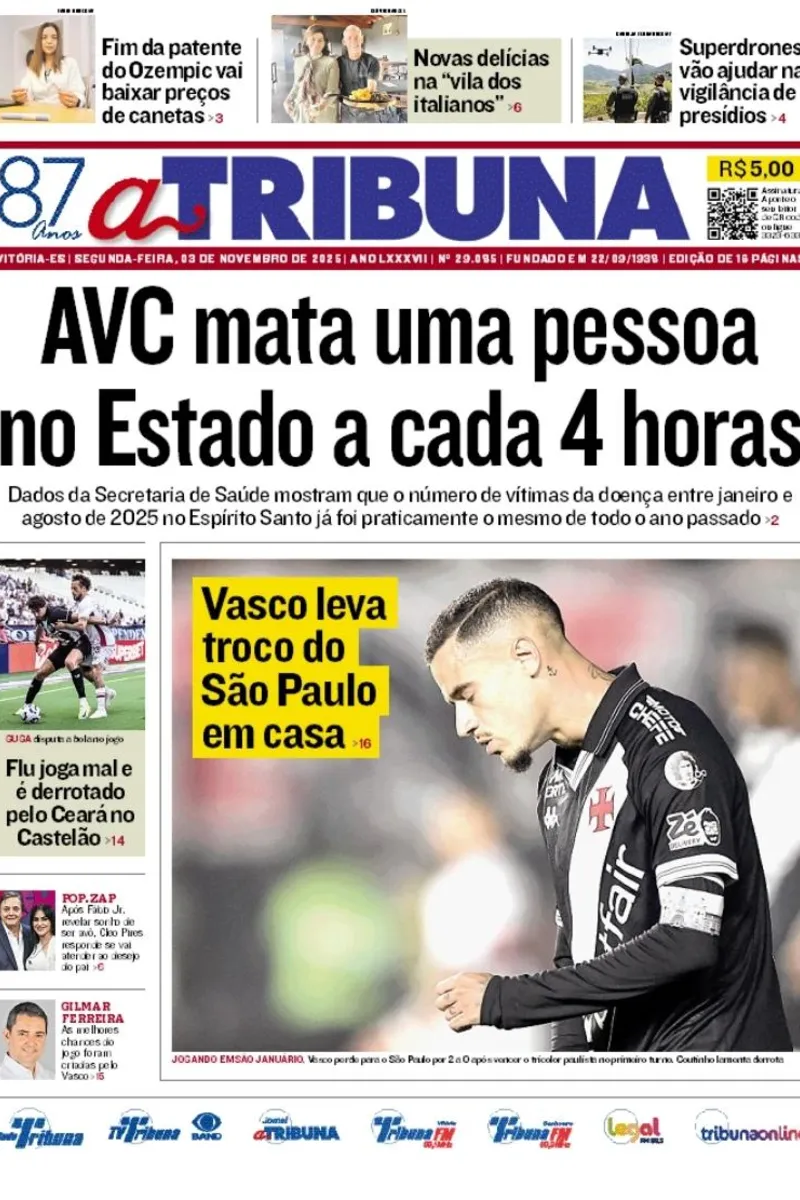 A edição do jornal A Tribuna desta segunda-feira, 03 de novembro, traz em destaque que AVC mata uma pessoa no Estado a cada 4 horas.