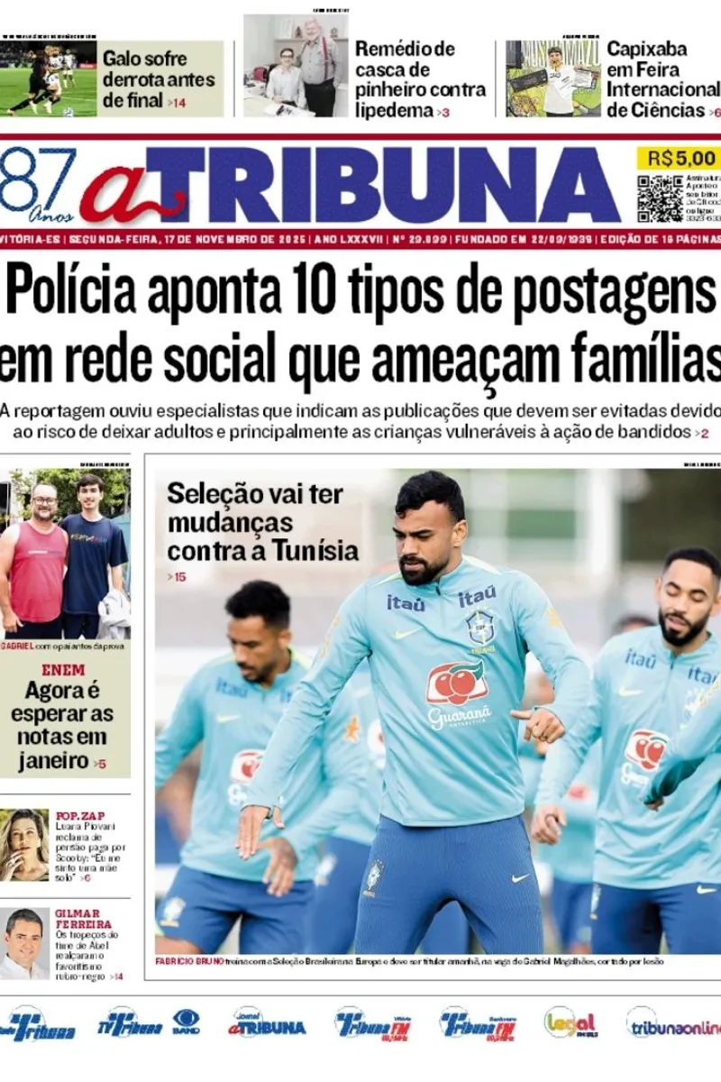 A edição do jornal A Tribuna desta segunda-feira, 17 de novembro, traz em destaque que polícia aponta 10 tipos de postagens em rede social que ameaçam famílias.