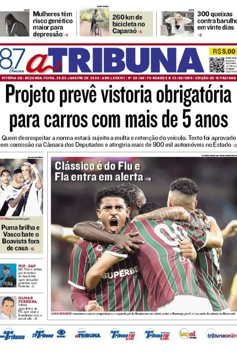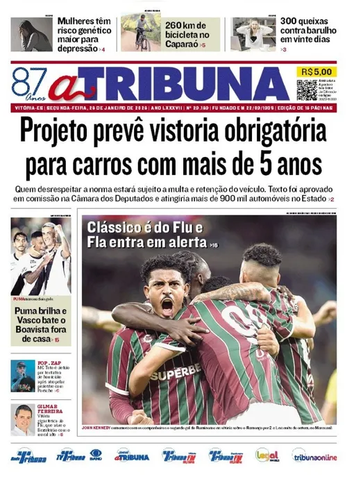A edição do jornal A Tribuna desta segunda-feira, 26 de janeiro, traz em destaque que projeto prevê vistoria obrigatória para carros com mais de 5 anos.