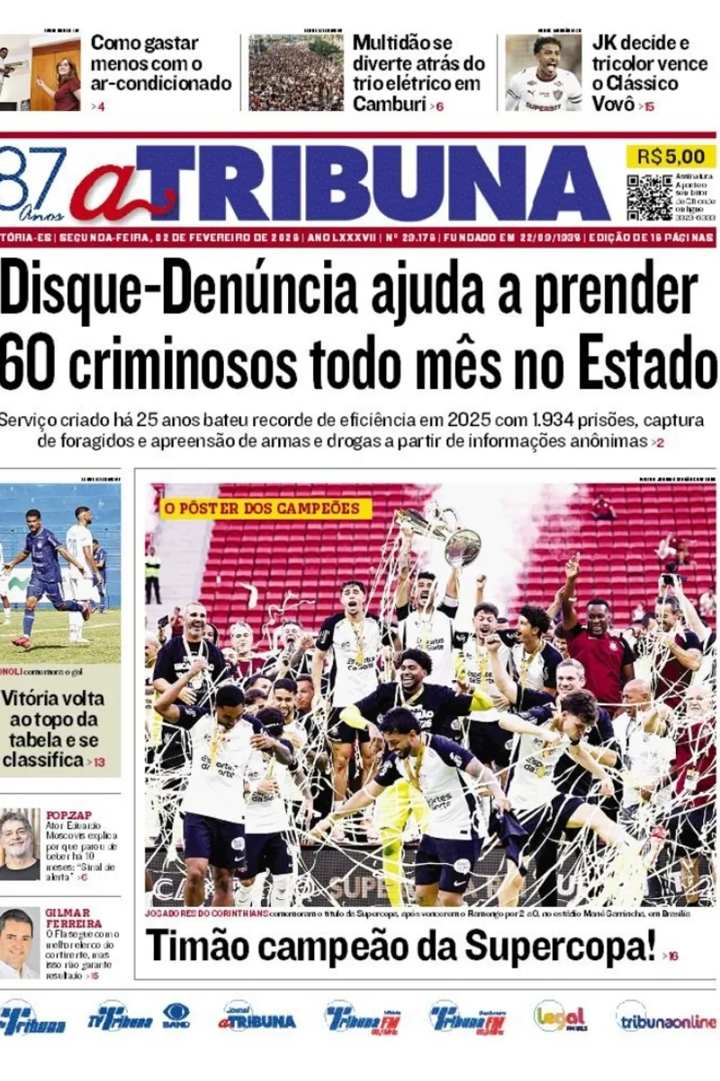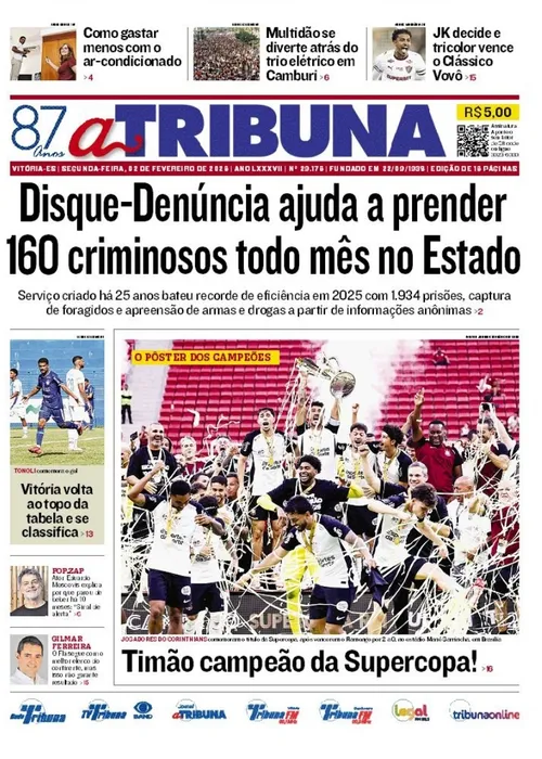 A edição do jornal A Tribuna desta segunda-feira, 02 de fevereiro, traz em destaque que Disque-Denúncia ajuda a prender 160 criminosos todo mês no Estado.