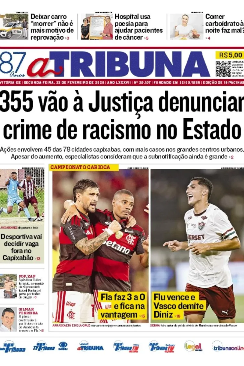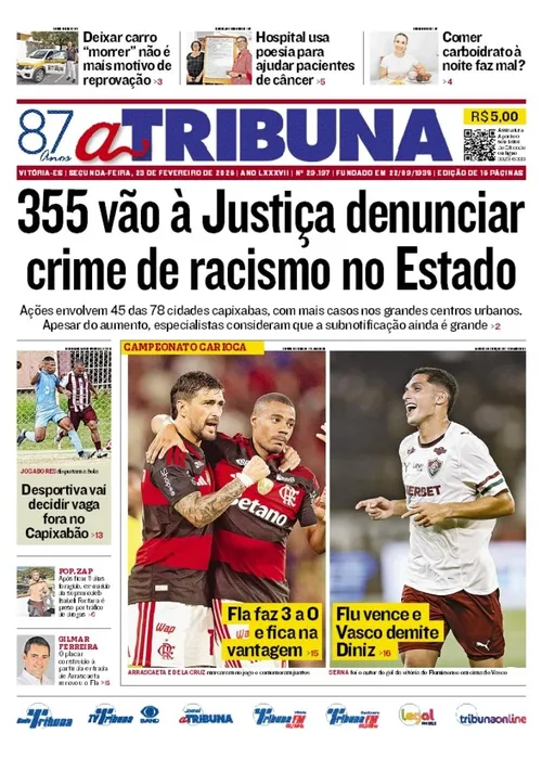 A edição do jornal A Tribuna desta segunda-feira, 23 de fevereiro, traz em destaque que 355 vão à Justiça denunciar crime de racismo no Estado.