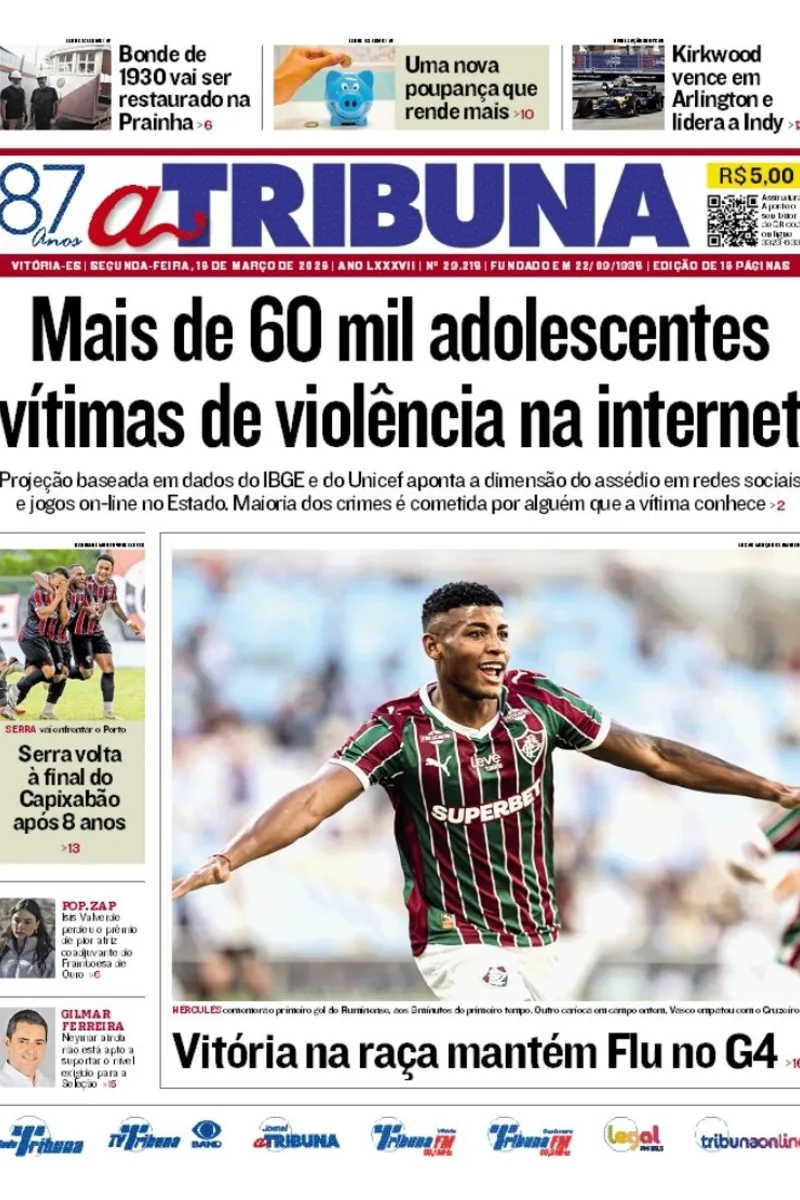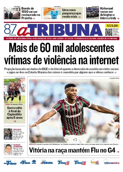 A edição do jornal A Tribuna desta segunda-feira, 16 de março, traz em destaque que mais de 60 mil adolescentes já foram vítimas de violência na internet.