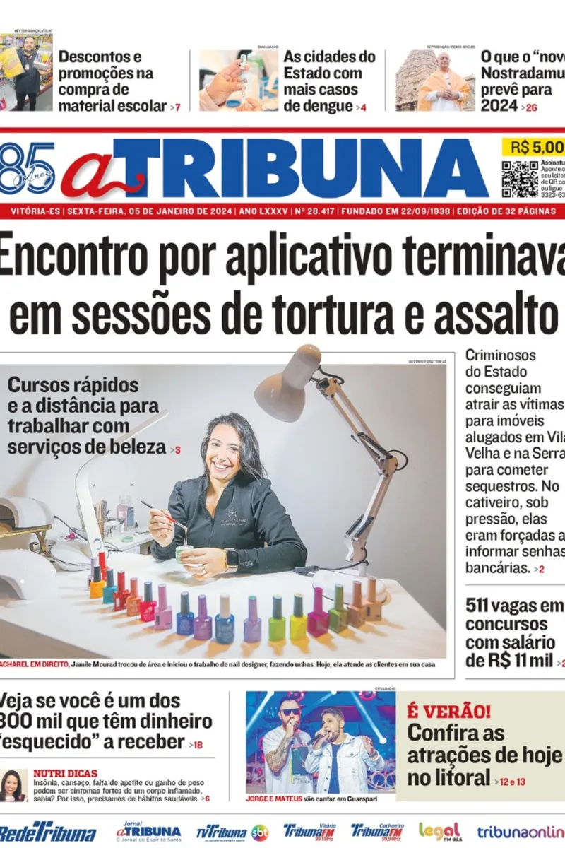 A edição do jornal A Tribuna desta sexta-feira, dia 05 de janeiro, traz em destaque que encontro por aplicativo terminava em sessões de tortura e assalto.