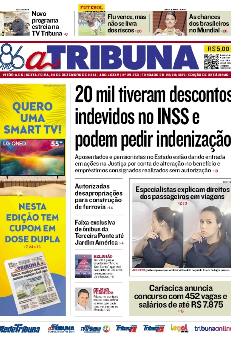 A edição do jornal A Tribuna desta sexta-feira, dia 06 de dezembro, traz em destaque que 20 mil capixabas tiveram descontos indevidos no INSS e podem pedir indenização.
