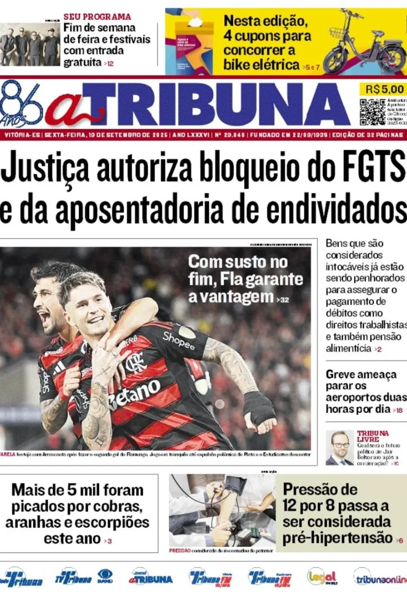 A edição do jornal A Tribuna desta sexta-feira, 19 de setembro, traz em destaque que Justiça autoriza bloqueio do FGTS e da aposentadoria de endividados.